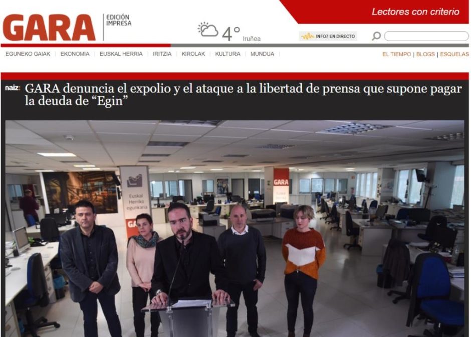 Una pequeña muestra de la solidaridad del PNV con los medios de comunicación…….»El dia 22 de noviembre de 1993, ETA mataba al sargento de la Ertzaintza, Joseba Goikoetxea, atentado que desencadenaria el inicio de un camino emprendido por el PNV contra toda la izquierda independentista, y que a corto y largo plazo, daría sus frutos. Goikoetxea había sido denunciado desde las paginas del diario EGIN en diferentes informaciones realizadas por el equipo de investigación dirigido por Pepe Rei. La maquinaria mediática y policial del PNV, comandada por Atutxa, se puso en marcha y comenzó una dura campaña contra el diario abertzale que pronto tendría sus consecuencias. El ministro de Interior español, Jose Luis Corcuera y el lehendakari Ardanza, alzaban la voz al unísono para solicitar el cierre inmediato de EGIN, un sueño que verían hecho realidad cinco años después. En concreto el ex lehendakari afirmaba que la “desaparición de EGIN sería un favor para la higiene democrática” (24 noviembre 1993). El justiciero Atutxa, uno de los politicos mas queridos en el Estado en aquellos años, pedía “el ahogo económico y el boicot institucional” (25 noviembre 1993). La operación policial estaba servida y solo una semana después, efectivos de la policia del PNV irrumpían en la redacción de Hernani y la delegación de Bilbo, con una orden judicial dictada por el juez Bueren, y que tenía el sello personal de Atutxa.