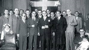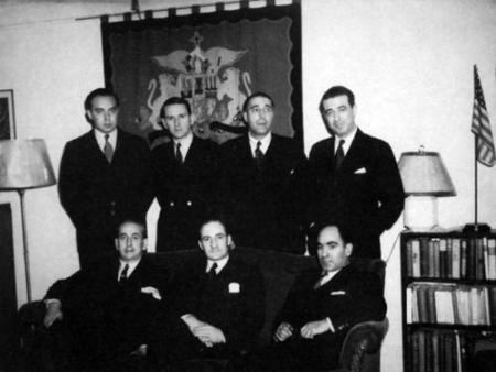Esta foto está sacada en la delegación del Gobierno Vasco en Nueva York que se encontraba en la V Avenida. Manu Sota es quien está de pie a la derecha. El resto son Consejeros del Gobierno y el Secretario General de la Presidencia, Antón Irala en 1946.
