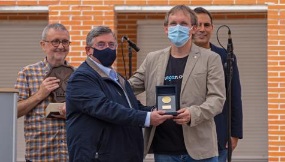 El alma del premio, el incansable Koldo Viñuales y el concejal Gómez Segura entregaron la talla y la medalla al director de la ikastola Joseba Tristan y Unai Gardoki.