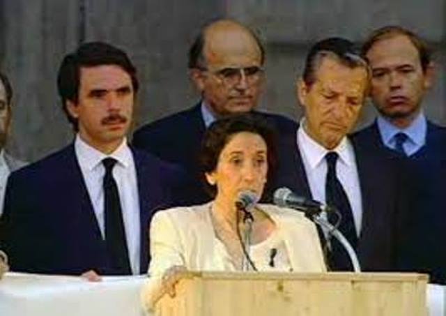 La organización es buena. Los sindicatos saben de qué va la cosa. No habían dicho dónde está la cabecera. Aznar tarda en llegar. Inopinadamente llega el presidente del Líbano cargado de guardaespaldas. Parecía una película de Berlanga. Saluda a Aznar y se va.  Felipe González busca su ubicación. No saluda. Incorpora a la pancarta a Iturgaiz. Y comienza la marcha. Impresionaban los gritos: «Vascos sí, ETA no», dichos por gentes de todas las edades y a grito pelado. Aznar me dice que escuche el grito. Ni una provocación. Y llegamos a la Puerta del Sol. Nos subimos al estrado. Era la primera vez en la que el PNV participaba en una manifestación de este tipo en Madrid. Atutxa es jaleado constantemente. A plaza llena, Victoria Prego, que siempre nos había tratado con respeto, lee su alegato contra la violencia. El «a por ellos, con la palabra y la justicia» se presta a equívocos y se lo digo. Me dice estoy equivocado. El tiempo me da la razón. En los cinco interminables minutos de silencio, un espontáneo saca la trompeta y toca una balada de retreta. Otros jalean a Atutxa, algunos piden que hable Ardanza. Detrás de nosotros, jóvenes con velas y cirios encendidos. Todo de difícil catalogación. Bajo el estrado, autoridades, partidos, el ex presidente de Uruguay, banqueros …