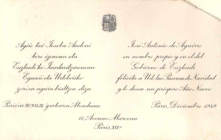 En un álbum de fotos de mi aita he encontrado esta felicitación de Navidad enviada por el Lehendakari Aguirre a mi aita, amigo de Juventud Vasca de Bilbao. Está enviada desde la Delegación del Gobierno Vasco en la Av.  Marceau de Paris, edificio en reclamación, y tiene el valor de haber sido puesta en correo nada menos que en 1949. Euzkadi está escrita con Z que es la manera con la que Sabino Arana creó el neologismo y  así consta en todos los documentos oficiales del primer gobierno vasco de nuestra historia. Además de estas tarjetas el Lehendakari Aguirre nunca dejó de transmitir su mensaje de Gabon, desde la primera Radio Euzkadi, que fue creada  hace 86 años, y no cuarenta, de no ser que lo anterior no haya existido y que Franco lo regeneró todo, llegando incluso a enviar el Lehendakari su mensaje de Gabon cuando se encontraba en las Navidades de 1940 huido en Berlín.