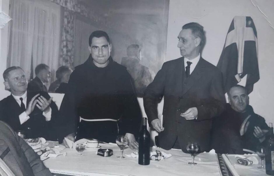 En la fotografía le vemos al franciscano Bitoriano Gandiaga recibiendo el 29 de marzo día de Aberri Eguna, en Donibane Lohizune, el premio José Antonio Agirre. La cantidad era de mil dólares y el poema ganador se titulaba Elorriko Loreak. El premio fue entregado por el Lehendakari Leizaola y podemos verle asimismo a Telefosfo Monzón, al P. Pedro Anasagasti y a Joseba Rezola.