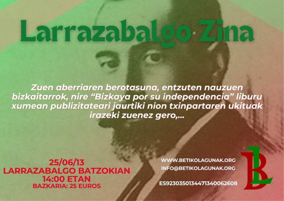 Un año más, la Asociación Betiko Lagunak, que puso en marcha Txomin Saratxaga, celebraremos la comida anual que recuerda el Juramento de Larrazabal del joven Sabino Arana.