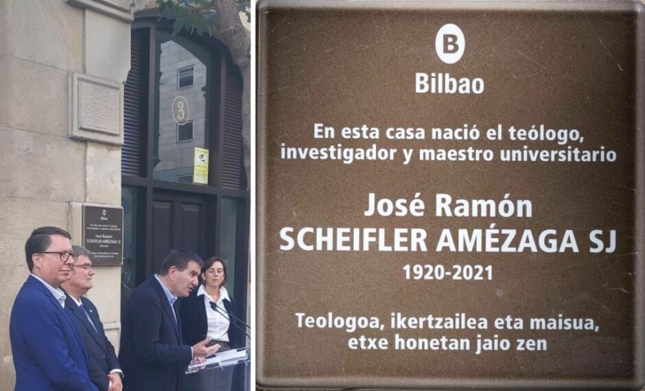 Estuve este viernes en la calle Berroeta Aldamar 3 en el acto de la colocación de una placa en la casa donde nació el teólogo jesuita y profesor universitario José Ramón Scheifler. El alcalde Aburto dijo que era una obligación honrar a una persona de la calidad humana del jesuita desaparecido en 2021 y, por su parte, el rector de la Universidad de Deusto Juan José Etxeberria recordó como su abuelo llegó a Bilbao de Bohemia, su aita fue consignatario de buques y José Ramón jugó en la Plaza Albia, amén del recuerdo al exilio que vivió la familia tras la guerra y la vida educativa y vocacional de un bilbaíno singular y tan valioso.