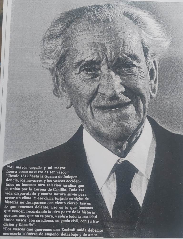 “Desde 1512 hasta la Guerra de Independencia, los navarros y los vascos occidentales no tenemos otra relación jurídica que la unión por la Corona de Castilla. Toda esa vida disparatada y contra natura sirvió para crear un clima. Y ese clima forjado en siglos de historia no desaparece con viento cierzo. Eso es lo que tenemos delante. Eso es lo que tenemos que vencer, recordando la otra parte de la historia que nos une, que no es poca, y sobre todo, la realidad étnica vasca, con su idioma, su genio civil, con su tradición y filosofía”.