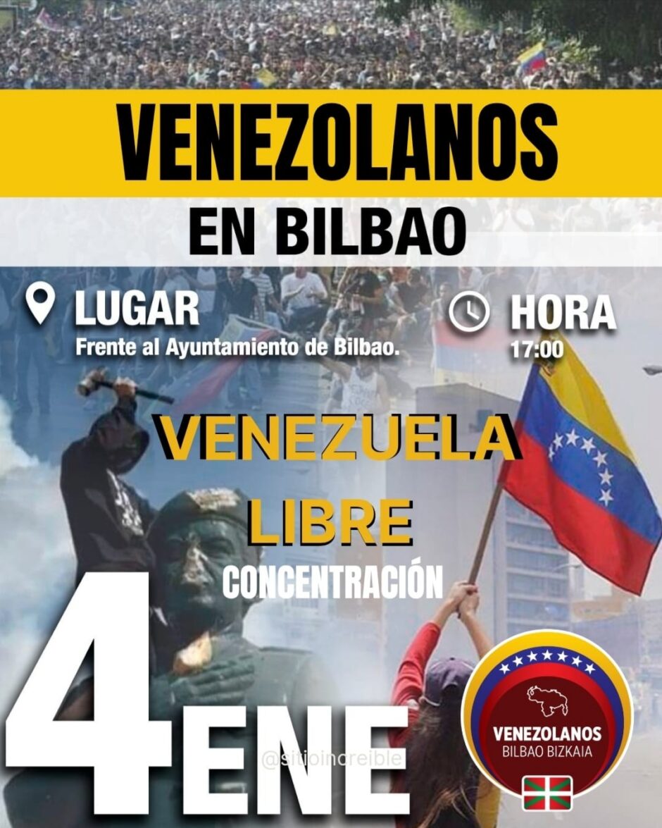 Dice DEIA en la noticia al respecto: «Por la tarde, a partir de las 17.00 horas, está prevista una segunda concentración, esta vez frente al Ayuntamiento de Bilbao, convocada por la plataforma Venezolanos en Bilbao Bizkaia. En este caso, la movilización tiene como finalidad celebrar lo que el colectivo considera el arresto del presidente venezolano, Nicolás Maduro, tras los recientes ataques de Estados Unidos en Caracas y su entorno.»