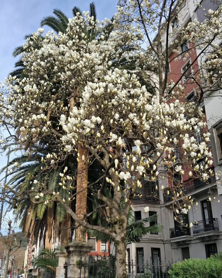 Eran dos. Dos magnolios .Uno de flor blanca y otro de flor rosada. Preciosos. Llamaban la atención. Un mal día, salía mi ama de casa y habían cortado ya el de las flores rosadas y se preparaban para cortar al que salvó montándoles un pollo a los mutiladores de tanta belleza. Me lo contó una vecina. Ella hizo lo que su sensibilidad le mandaba .Y lo salvó. Y sigue floreciendo todos los años en enero. Y nosotros nos enorgullecemos de este pequeño gesto de nuestra ama.
