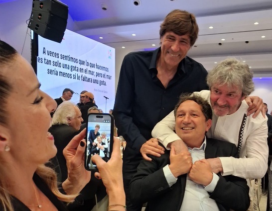 En la foto aparece Olga, la esposa de Julio Salinas, delantero del Athletic, Txema Vaquero de la Real Sociedad y Eusebio Sacristán, entrenador de varios equipos entre ellos de la Real. Y si se fijan aparece un letrero proyectado en la pantalla que dice: ”A veces sentimos que lo que hacemos es tan solo una gota en el mar, pero el mar sería menos, si le faltara una gota”.