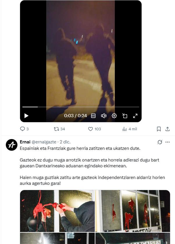 Las juventudes de EH Bildu, un partido que hace solo unos días hablaba de alternancia en el gobierno vasco, pintan, ensucian y ejercen la violencia directa (los eufemismos, para quien los quiera) sobre sedes de instituciones o partidos políticos y mobiliario urbano. ¿Por qué? Porque Ernai ha entrado en una competición con GKS en la que perdemos todas y todos. Como si las y los de GKS, además, no fuesen a votar a Bildu en las próximas elecciones, sean las que sean. Pero la tensión dentro de la izquierda abertzale está ahí, es visible y sucia (en un amplio sentido), y está cebada con la romantización de la violencia, ¡qué inmenso error!
