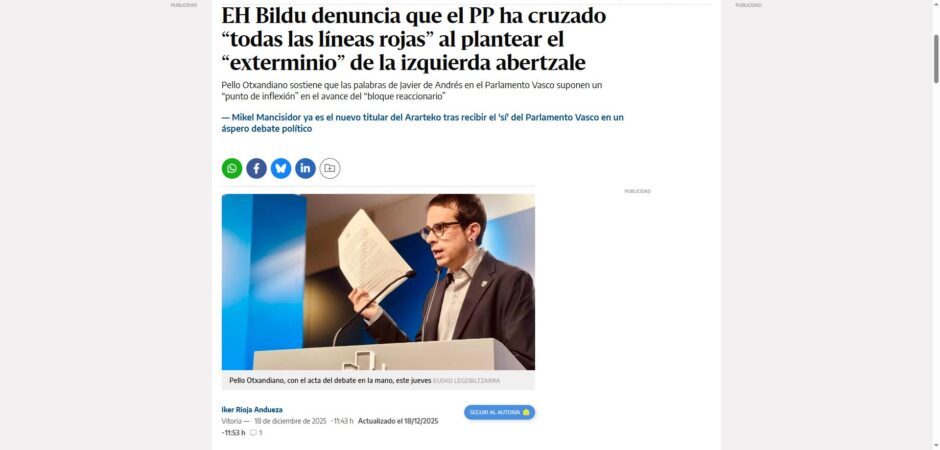 En el amigo invisible, a Javier de Andrés le ha tocado Pello Otxandiano y, como no sabía qué comprar, ha decidido regalarle una experiencia: “EH Bildu denuncia que el PP ha cruzado ‘todas las líneas rojas’ al plantear el ‘exterminio’ de la izquierda abertzale” (El Diario). De Andrés es Olentzero, Maridomingi y todos los galtzagorris juntos. ¡Qué presente! Y qué futuro el del político del PP, tan extremado, tan echado al monte, con la mira fuera del tiesto, y al que le brota, le salen a borbotones palabras como “exterminio” en la tribuna del Parlamento para referirse a los rivales políticos. Todas y todos necesitamos las vacaciones, y de Andrés, más.