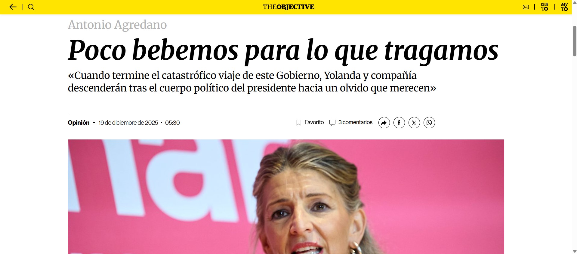 Disfruto leyendo a otros columnistas. No me importa lo que opinen, pero sí que escriban bien, y nadie ha escrito como Antonio Agredano el ocaso de Yolanda Díaz: “Pablo Iglesias, que no tiene una idea buena, la eligió a dedo para sucederle. Aún eran tiempos de vértigo y coleta. Él iba a parar el fascismo y terminó abriendo un bar”. “Alguna vez analizaremos los años de Podemos en el Gobierno de España y tendremos que hacerlo con un gorro de papel de aluminio puesto. Nunca tan poco talento dio tanto de sí”. Como recuerda Agredano, tanto Iglesias como Iván Redondo vaticinaron que Díaz sería presidenta del Gobierno.