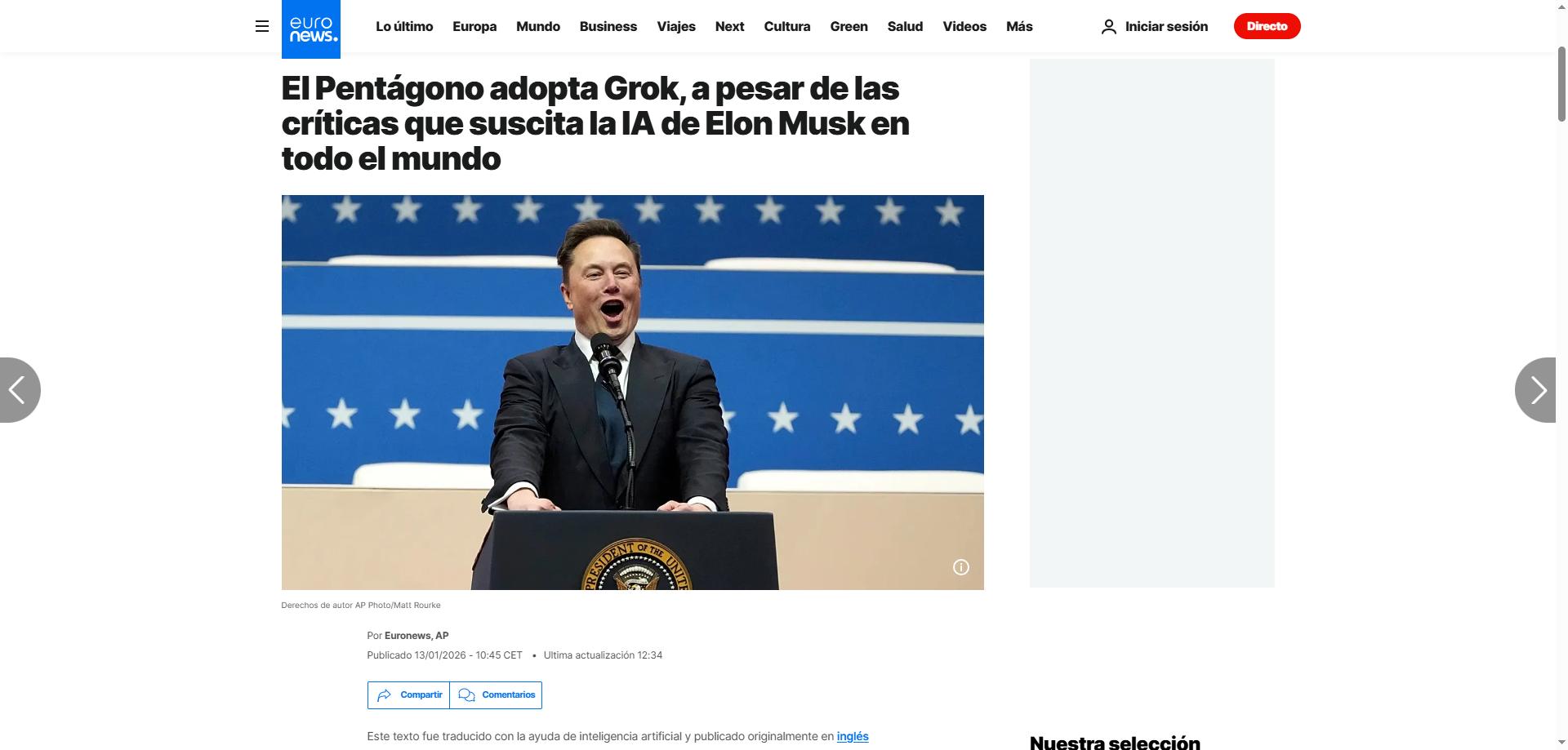 “El Pentágono adopta Grok, a pesar de las críticas que suscita la IA de Elon Musk en todo el mundo”. En el cuerpo de la noticia, en Euronews, concretan que esas “críticas” son “por generar imágenes ‘deepfake’ altamente sexualizadas de personas sin su consentimiento”. Ante las denuncias y reacciones, “Grok ha limitado la generación y edición de imágenes para los usuarios de pago”. Es decir: en el ejército estadounidense van a poder seguir desnudando a ex novias e incluso niñas (esta es la acusación más grave) con Grok. Por supuesto, el hombre más rico del mundo seguirá siéndolo gracias a supercontratos públicos como este.