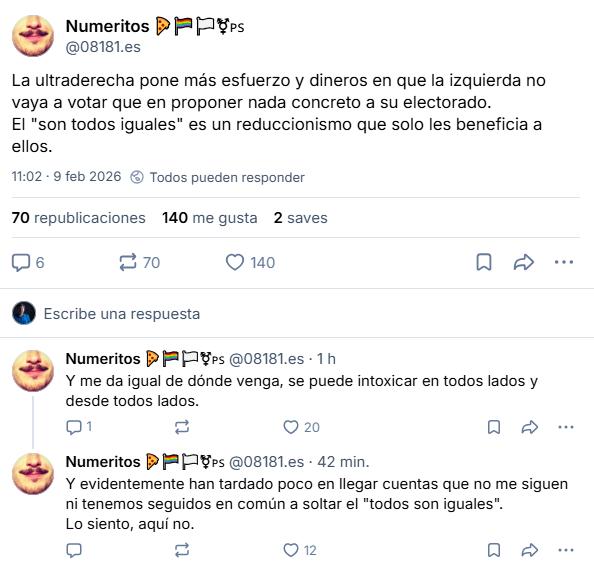 Se que me salgo del mood general en Euskadi (especialmente, en los medios) cuando señalo que los mecanismos que utiliza Vox para ascender son exactamente los mismos que utiliza EH Bildu. El discurso que llaman “de izquierdas” es realmente lo de menos. Sobre el crecimiento de Vox en Aragón, Numeritos en Bluesky apunta a la desmovilización como motor de los ultras, y al ventilador (especialmente, el mediático) como mecánica para generar esa desafección. Así suben unos allí y otros, aquí. Del paralelismo entre Bipartidismo Stream y Gure Bideoak también podríamos hablar. Pero nadie quiere. Ay, la omertà.
