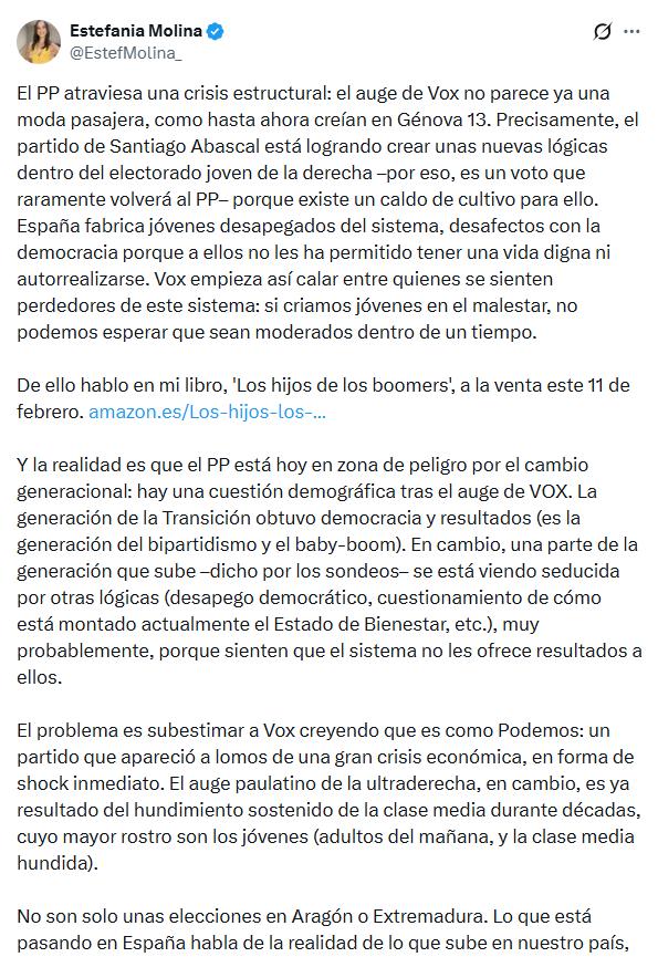 Llevo mucho tiempo observando un paralelismo preocupante entre lo que hace crecer a Vox en España y lo que hace crecer a EH Bildu en Hegoalde. Estefanía Molina ofrece otro hack en uno de sus posts en X de promoción de su libro: “Si criamos jóvenes en el malestar, no podemos esperar que sean moderados dentro de un tiempo”. Ella se refiere al motivo por el que la juventud abandona posturas moderadas y se refugia en Vox. Y el mecanismo, insisto, me recuerda mucho al de la izquierda abertzale que, en el caso del sur de nuestro país, se ha pasado de frenada: una parte de la juventud vasca se echa, cada vez más, en brazos de GKS.