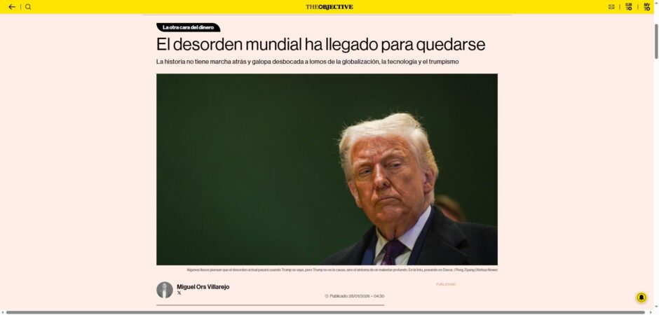 Escribe Miguel Ors en The Objective que “el desorden mundial ha llegado para quedarse”, que “no es posible desinventar las innovaciones” y que “Trump no es la causa, sino el síntoma de un malestar profundo”, por lo que cree que “los políticos que vengan detrás de Trump no se desmarcarán de él, sino que lo imitarán”. Añade una última recomendación: “Para triunfar en los tiempos que corren tienes que adoptar la estrategia de Iglesias, de Sánchez y de Abascal: ignorar los hechos e insistir en el relato”. Evidentemente, este mundo no me gusta, y no dejo de preguntarme cómo hemos acabado así.