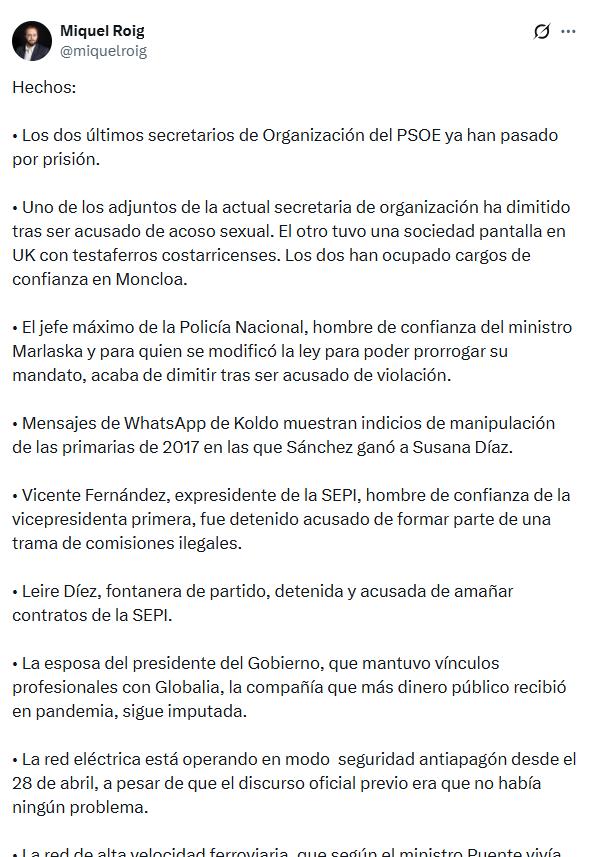 Miquel Roig escribió su tuit la semana pasada pero, como intento entrar en X cada día menos, he tardado en verlo. Además, me viene estupendamente para arrancar la semana: el director adjunto en El Confidencial se ha limitado a recopilar, con su estupenda prosa, los “hechos” que rodean a Pedro Sánchez, ese presidente ausente (esto no es de Roig, es mío, después de ver su periplo indio). Empieza fuerte: “Los dos últimos secretarios de Organización del PSOE ya han pasado por prisión”, y sigue con los casos de acoso sexual, la falta de presupuestos, Adamuz y el apagón, personajes como Leire Díez y, por supuesto, “la esposa del presidente”.