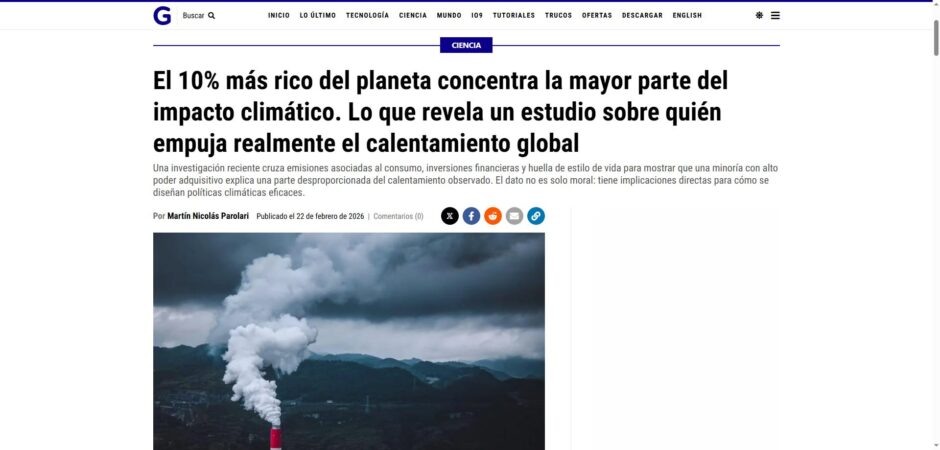 Hay que acabar (deslegitimándoles socialmente e imponiendo una fiscalidad del 100% a partir de los diez millones de dólares, por ejemplo) con las y los ultrarricos. Es inaplazable si queremos que nuestra civilización no colapse. No exagero, describo y, lo siento, las noticias me dan la razón: “El 10% más rico del planeta concentra la mayor parte del impacto climático. Lo que revela un estudio sobre quién empuja realmente el calentamiento global” (Gizmodo). Más claro: “La investigación conecta directamente la actividad económica del 10% más rico con eventos extremos como las olas de calor y las sequías en la Amazonía”.