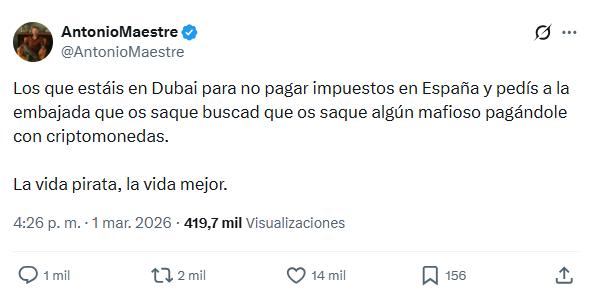 Algunas y algunos están descubriendo ahora, a golpe de misilazo, qué supone mudarse a Oriente Medio porque España les roba (los impuestos, por supuesto), además de una horterada. Me puedo poner macarra, puedo ser injusto también con quien ha ido allí a trabajar, desplazado por su empresa, que cotiza debidamente, pero no creo que pueda superar la precisión de Antonio Maestre en su crítica: “Los que estáis en Dubái para no pagar impuestos en España y pedís a la embajada que os saque buscad que os saque algún mafioso pagándole con criptomonedas. La vida pirata, la vida mejor”.