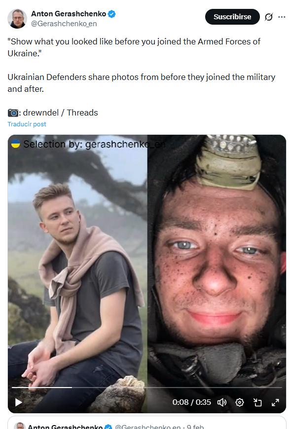 En este momento de sensibilización máxima hacia las consecuencias de la guerra, rescato el tuit de Anton Gerashchenko en el que muestra una consecución de fotos: el antes y el después de ucranianas y ucranianos a las y los que no les quedó más remedio que dar un paso al frente y coger un fusil. Suciedad, cansancio, empeoramiento de las condiciones de vida… Y eso sin hablar de heridas, mutilaciones o la muerte. Así es la puta guerra. Ojalá Donald Trump pudiera verla tan cerca que por fin lo entienda, ojalá Netanyahu sienta que eso le puede pasar. Ojalá quienes han justificado a Vladímir Putin se avergüencen, por lo menos, un poco.