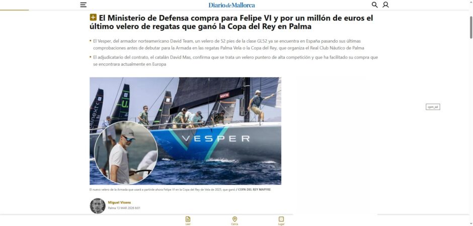 Luego dirán que digo, pero es que tiene tela lo que cuentan en el Diario de Mallorca: “El Ministerio de Defensa compra para Felipe VI y por un millón de euros el último velero de regatas que ganó la Copa del Rey en Palma”. Dice el gobierno de España, el de Sánchez, Díaz y el pacifismo para la pegatina, que lo adquiere “para la formación y adiestramiento de oficiales de marina” pero también para “su ocasional utilización en regatas”, y que el nuevo barco “sustituirá al Aifos en el que navega el rey Felipe VI desde sus años de Príncipe de Asturias, principalmente en la Copa del Rey”, adquirido con la misma excusa, digo, de la misma forma.