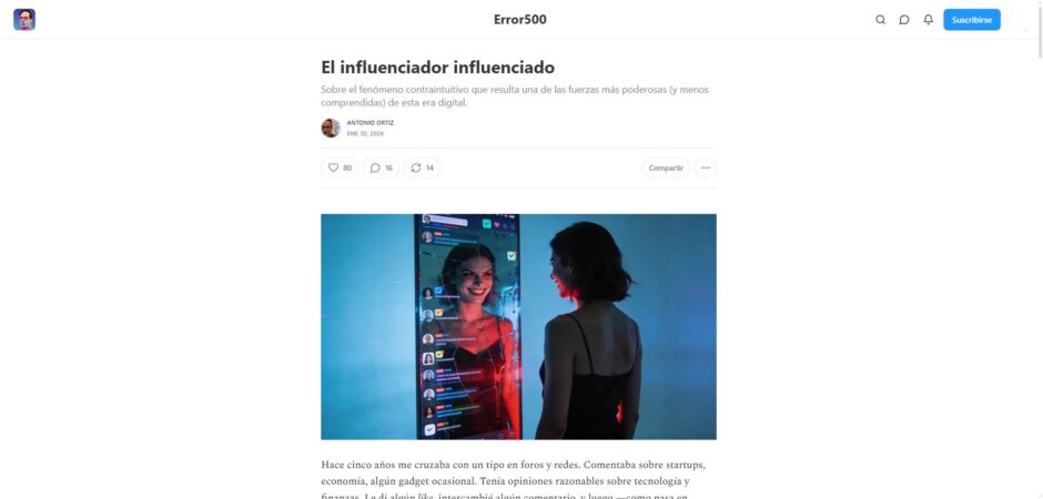 Antonio Ortiz es uno de mis autores favoritos hoy. Sus reflexiones sobre inteligencia artificial o sobre la evolución del uso de Internet son muy valiosas. En uno de sus últimos posts (“El influenciador influenciado”), habla de las espirales en las que han entrado muchos creadores de contenidos en Internet, lo que nos pone sobre la pista de varias cosas que van mal: la búsqueda de atención, el modelo de negocio, lo que quiere ver la gente (que es muy perverso y, cada vez, más) o la necesidad de venderse a ese público. “Si vas con la idea de ser un creador famoso, ya de por sí estás destinado a ser el influenciado”, concluye.