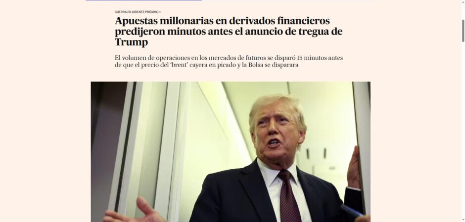 Solo hay que leer el titular y el subtítulo de esta noticia en Cinco Días para entender cómo va el negocio: “Apuestas millonarias en derivados financieros predijeron minutos antes el anuncio de tregua de Trump. El volumen de operaciones en los mercados de futuros se disparó 15 minutos antes de que el precio del ‘brent’ cayera en picado y la Bolsa se disparara”. Queda claro, ¿no? No es el petróleo para que EE.UU. siga siendo el líder económico en el mundo, no es la presión del lobby judío y que le dice Netanyahu, ni mucho menos es la búsqueda del premio Nobel de la paz: lo que mueve a Trump es enriquecer a los suyos empezando por él.
