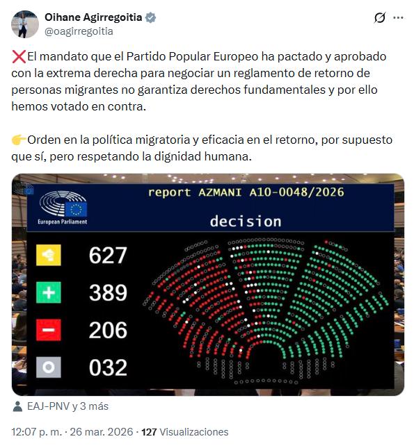 Arranco la semana con un tuit de la anterior: “El Partido Popular Europeo ha pactado y aprobado con la extrema derecha para negociar un reglamento de retorno de personas migrantes no garantiza derechos fundamentales”. Lo escribe la jeltzale Oihane Agirregoitia en X, y anuncia en el mismo tuit: “Por ello hemos votado en contra. Orden en la política migratoria y eficacia en el retorno, por supuesto que sí, pero respetando la dignidad humana”. Es muy peligroso el juego de la derecha que se alinea con el monstruo nazi y, al mismo tiempo, con los antieuropeístas (que es otra manera de decir “el monstruo nazi”). Tomamos nota.