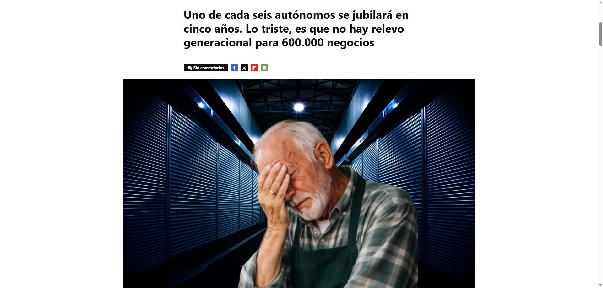 Por fin es lunes y, si eres de los privilegiados que trabaja solo de lunes a viernes y los fines de semana no tiene ni que encender el ordenador, enhorabuena. Vamos a empezar, en cualquier caso, la semana con fuerza, con energía, con alegría, porque si no nos vamos a la mierda ante noticias como esta: “Uno de cada seis autónomos se jubilará en cinco años. Lo triste, es que no hay relevo generacional para 600.000 negocios” (Pymes y Autónomos). Como todas y todos sabemos, este “drama” “amenaza especialmente a pequeñas empresas familiares, comercios de proximidad y oficios tradicionales”. Pero, ¿quién abre o continúa un negocio hoy?