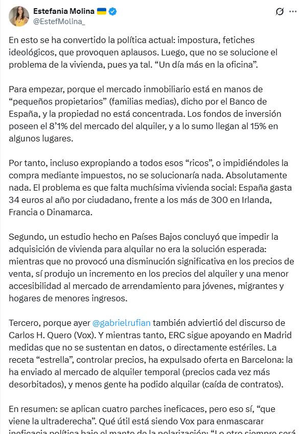 Estefanía Molina tiene un discurso sobre vivienda tan valiente como interesante. El problema en España es “que falta muchísima vivienda social” y que “se aplican cuatro parches ineficaces”. Continúa: “Pero. eso sí, ‘que viene la ultraderecha’. Qué útil está siendo Vox para enmascarar ineficacia política bajo el manto de la polarización”. Hoy, la política se basa en “impostura y fetiches ideológicos que provoquen aplausos”. ¿La verdad? “España gasta 34 euros al año por ciudadano, frente a los más de 300 en Irlanda, Francia o Dinamarca”, y en el caso catalán: “Controlar precios ha expulsado oferta en Barcelona”.