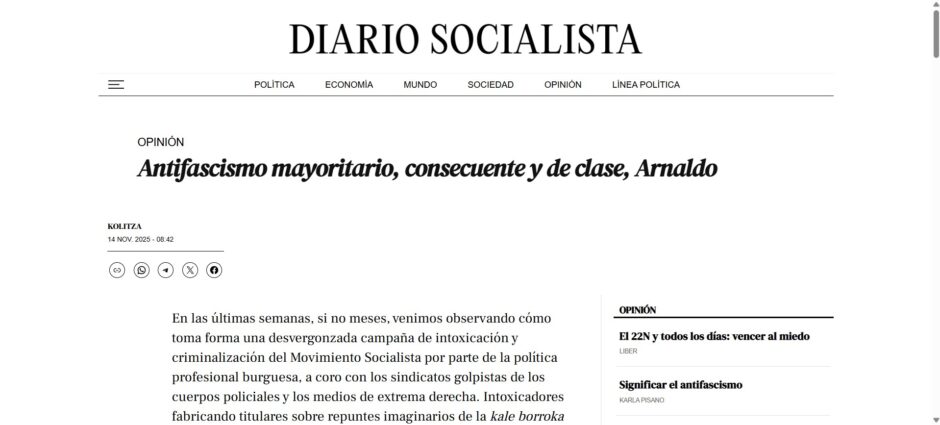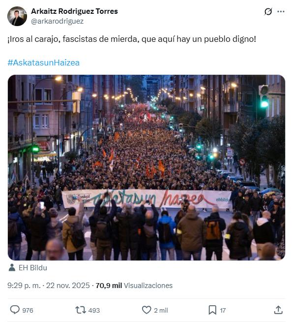 Por supuesto, suscribo las palabras de Arkaitz Rodríguez: “¡Iros al carajo, fascistas de mierda, que aquí hay un pueblo digno!”. Unas palabras que escribe por segunda vez, por cierto. Se hizo gracia en la primera ocasión en la que las dijo y, como no tenía público para aplaudirle, repite. Lo que pongo en duda es la legitimidad de Rodríguez para ser tan expresivo contra el fascismo si convive (cuando no recibe indicaciones) con fascistas en Sortu. Uno es antifascista en todo momento y en todo lugar, pero si hace alguna excepción, por lo que sea, no es antifascista, sino oportunista. Si algo hay que hacer contra el fascismo es hablar claro.