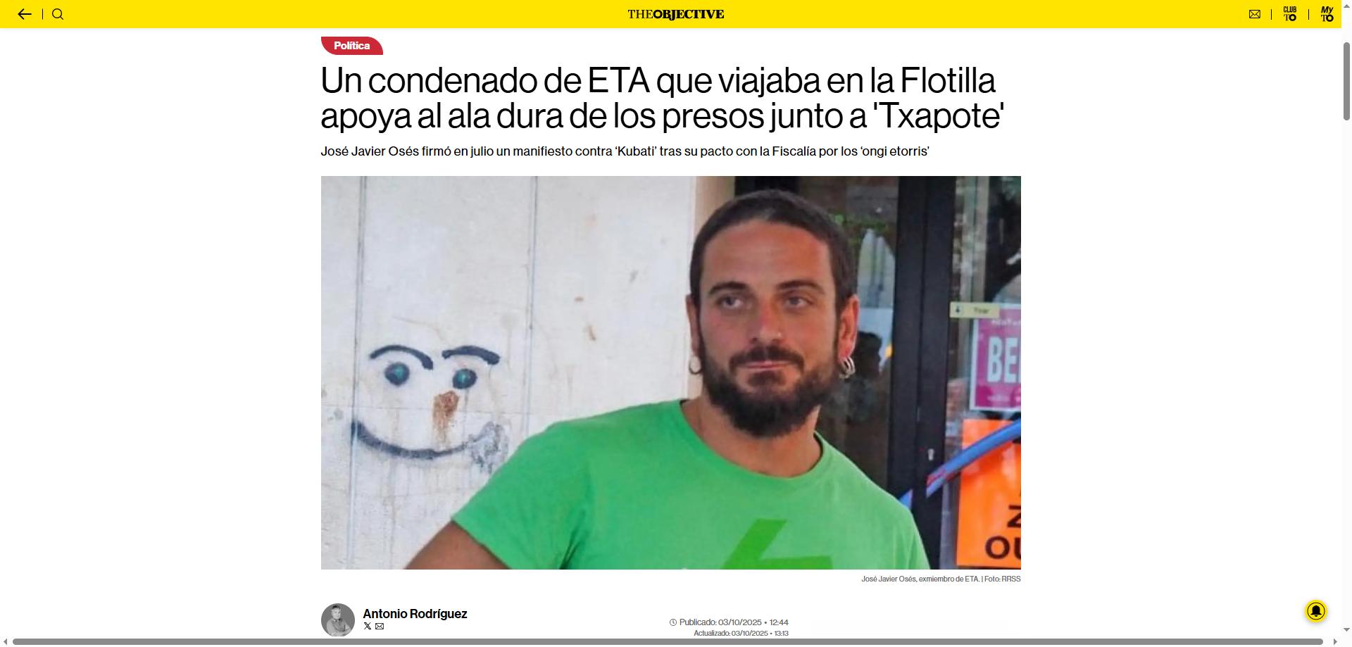 No voy a debatir si los expresos de ETA tienen todos sus derechos restituidos: los tienen. Tampoco voy a cuestionar la voluntad de la mayoría de las y los que se la jugaron en la “flotilla” mientras los demás tuiteamos desde casa. Pero sí debemos plantearnos si debemos permitir que algunos blanqueen su pasado con el genocidio israelí. ¿Quién regala a Ayuso el argumento y a The Objective el titular: “Un condenado de ETA que viajaba en la Flotilla apoya al ala dura de los presos junto a ‘Txapote’”? ¿No deberían ser reprobados moralmente José Javier Osés e Itziar Moreno? ¿Quién sale ganando? ¿Quién pierde?