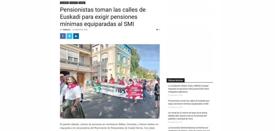 Pienso más en la jubilación que en el plan del próximo sábado por la noche, así que, por supuesto, me parece bien la equiparación de las pensiones mínimas al SMI, como reivindica el Movimiento de Pensionistas de Euskal Herria. Me parece tan bien que desearía que sus peticiones, sus esfuerzos, sus manifestaciones y sus declaraciones fueran en el sentido correcto y se dirigiesen al gobierno español, que es el que fija el SMI y los umbrales de las pensiones, y que las abona. Las reivindicaciones dirigidas a instituciones vascas tienen más de objetivo político que de social, digámoslo claro. Y repitámoslo cuando haga falta.
