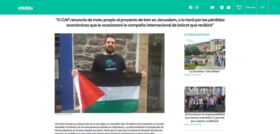 CAF no fabrica armas pero en Euskadi el genocidio que el gobierno y el ejército israelíes ejecutan en Gaza ha sido redimensionado por la izquierda abertzale (en la web de EH Bildu hacen una entrevista a su candidato en Ordizia, Asier Álvarez de Eulate, que amenaza directamente a CAF con un boicot internacional) atrapando a la empresa ferroviaria vasca. ¿Por qué? Y lo que es más importante: ¿por qué volvemos a asistir a la manipulación del sufrimiento ajeno (el sufrimiento que provocan 65.000 personas asesinadas) para el lavado de cara propio y no nos revelamos contra ello?