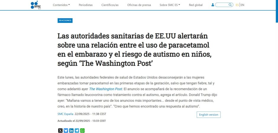 Donald Trump ha asumido esta cruzada como suya: “Las autoridades sanitarias de EE.UU. alertarán sobre una relación entre el uso de paracetamol en el embarazo y el riesgo de autismo en niños”. “Creo que hemos encontrado una respuesta al autismo”, ha dicho el propio Trump, adelantándose a “la recomendación de un fármaco llamado leucovorina como tratamiento contra el autismo”. Vaya, como si alguien quisiera vendernos algo… En Science Media Centre han recopilado varias reacciones profesionales negando la relación que ha afirmado, ya para siempre, el gobierno EE.UU. con su presidente al frente.