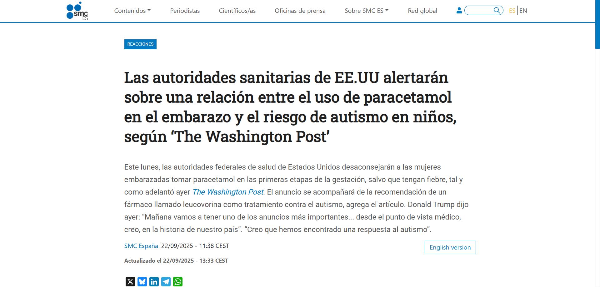 Donald Trump ha asumido esta cruzada como suya: “Las autoridades sanitarias de EE.UU. alertarán sobre una relación entre el uso de paracetamol en el embarazo y el riesgo de autismo en niños”. “Creo que hemos encontrado una respuesta al autismo”, ha dicho el propio Trump, adelantándose a “la recomendación de un fármaco llamado leucovorina como tratamiento contra el autismo”. Vaya, como si alguien quisiera vendernos algo… En Science Media Centre han recopilado varias reacciones profesionales negando la relación que ha afirmado, ya para siempre, el gobierno EE.UU. con su presidente al frente.