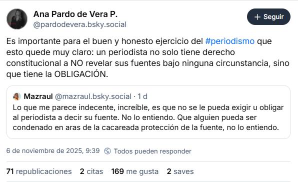 El juicio al fiscal general del Estado, Álvaro García Ortiz, está siendo muy útil para recordar qué diferencia a un periodista de un podcaster: las y los periodistas estamos amparados por el secreto profesional. Ana Pardo de Vera lo explica así en Bluesky: “Es importante para el buen y honesto ejercicio del periodismo que esto quede muy claro: un periodista no solo tiene derecho constitucional a no revelar sus fuentes bajo ninguna circunstancia, sino que tiene la obligación”. Así que, sí, los periodistas pueden (y deben) negarse ante el juez a responder cuál es su fuente, como estamos viendo. Eso garantiza que seguiremos informados en el futuro.