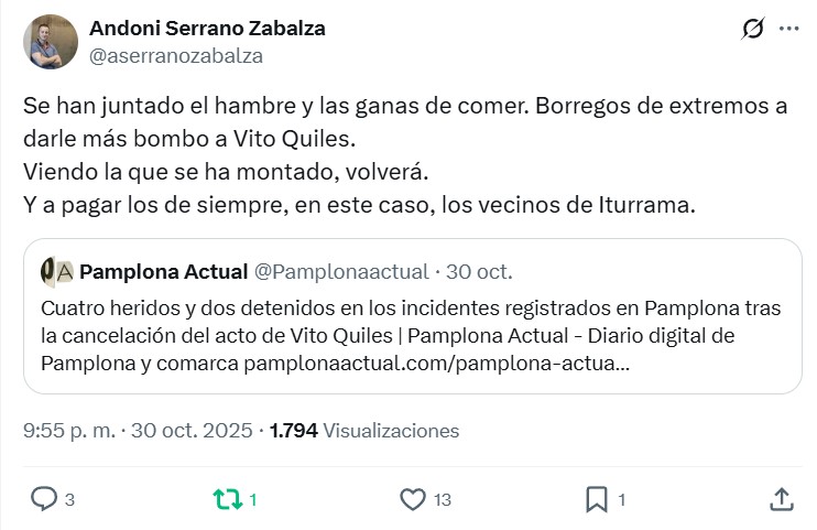 Unas cuantas horas antes del desfile de sudaderas Lonsdale negras y pasamontañas del mismo color, ya había leído la mejor respuesta desde Iruñea a Vito Quiles, la de Rafael Domingo, docente de la Universidad de Navarra, que, curiosamente, vale también para los disfrazados de antifascistas: “El acto político no es el acto en el que están presentes los políticos, como tú defiendes, sino aquel que busca influir en la toma de decisiones, promover una ideología o ganar apoyo público”. En el mismo tuit, Domingo recordaba: “He visto con mis propios ojos los seis atentados perpetrados por ETA en ese centro académico”.