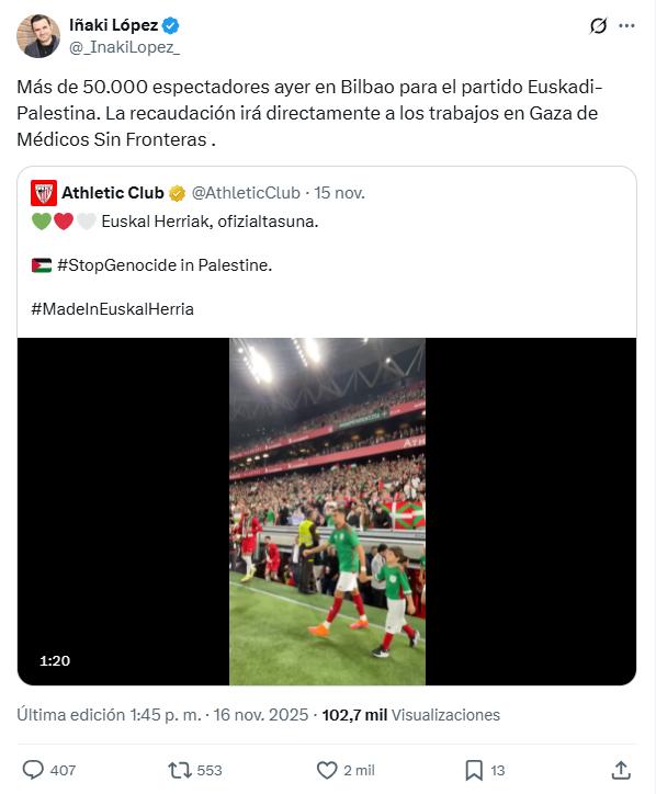 El desconocimiento que entonces exhibieron los jugadores, instigado por la izquierda abertzale que se apropia de la solidaridad vasca (Arakaitz Rodríguez lo exhibe en X sin rubor), la misma izquierda abertzale que el sábado guardó las banderas del territorio navarro, y el desconocimiento generalizado (necesario para gritar “Gora ETA” en el minuto de silencio) son solo piedras en el camino: la selección de Euskadi, como este país, logrará sus objetivos de tener una identidad propia. Hubo mucha gente que lo intentó (cuando a la izquierda abertzale ni estaba ni se le esperaba) y otros muchos, otras muchas, nos sucederán en la reivindicación.