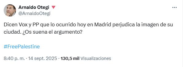 No habla claro Arnaldo Otegi en X porque sabe que no puede: su intento de dejar caer paralelismos entre declaraciones de irresponsables peperos y de instituciones vascas es burdo porque que si señalamos las diferencias sale perdiendo. Ojalá en Euskadi las protestas contra la presencia del Israel Premier Tech no hubiesen sido capitalizadas por fascistas con urgencias por tapar sus vergüenzas. Ojalá en Euskadi las protestas no hubiesen sido violentas (sí, mover una valla al paso de ciclistas esprintando es violencia porque atenta contra su integridad). Y esa exigencia ética debería de ser reivindicada por quien se manifestó con la mejor voluntad.