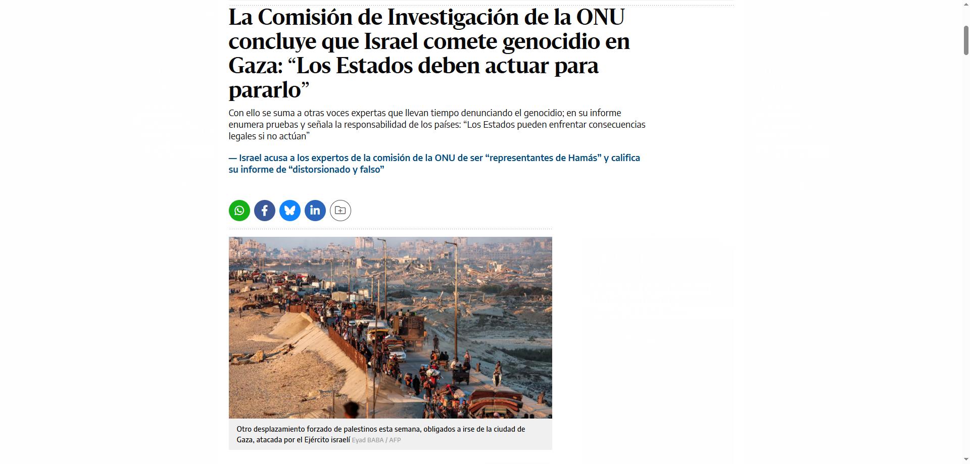 Por mucho que hagamos en las calles, son los Estados, los gobiernos, los que pueden parar a Israel. No lo digo yo, lo dice “la Comisión de Investigación de la ONU” que “concluye que Israel comete genocidio en Gaza”. Su conclusión es clara: “Los Estados deben actuar para pararlo” (El Diario). De momento, el estado español lo está haciendo, más por oportunismo que por la acción de la ciudadanía que boicotea una vuelta ciclista a España en la que el Israel Premier Tech no tenía que haber participado (el Gazprom-RusVelo fue baneado por la misma UCI que ahora defiende lo contrario). Sí, toca a los gobiernos hacer y a nosotros, seguir exigiendo que actúen.