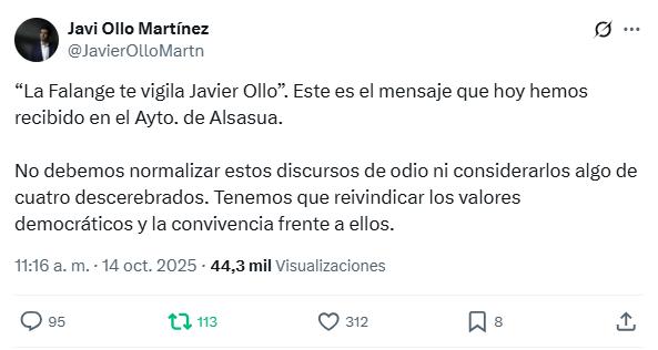 Ese es el mensaje que ha recibido Javier Ollo, alcalde de Altsasua: “La Falange te vigila”. Él mismo explica que “no debemos normalizar estos discursos de odio ni considerarlos algo de cuatro descerebrados. Tenemos que reivindicar los valores democráticos y la convivencia frente a ellos”. Estoy de acuerdo. La Falange, como bien dijo el diputado general de Araba, Ramiro González, tendría que estar ilegalizada, pero en esa España suya todo es posible, y en esta Euskadi nuestra sufrimos las consecuencias de que algunos quieran enfrentarse a la extrema derecha por las encuestas y por quemar unos contenedores de buena mañana.