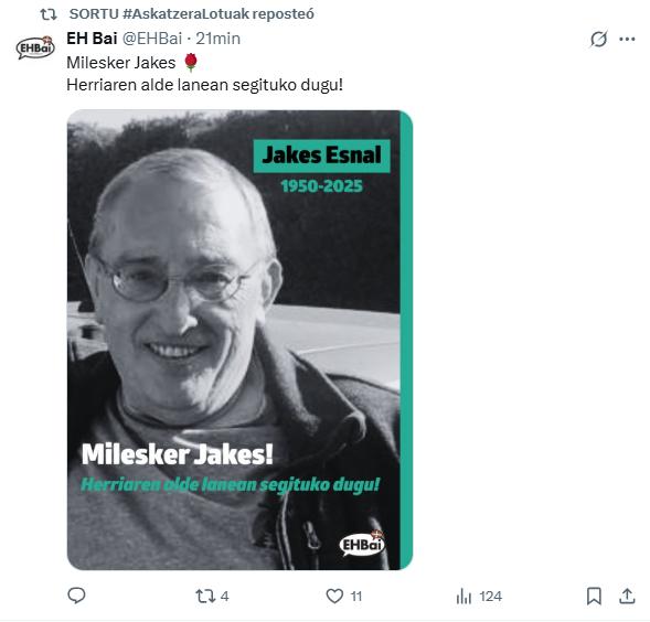 Euskadi es un país tan extraño a veces que hablar de ETA parece extemporáneo pero llevamos dos semanas debatiendo sobre si podemos o no prohibir el paso de la Falange de Primo de Rivera por Gasteiz. Pero la izquierda abertzale sigue reivindicando a la banda que mató a más de 850 personas: EH Bai, la marca en Iparralde de EH Bildu, ha agradecido en X (“milesker”) el trabajo a favor del pueblo que hizo Jakes Esnal, que estuvo condenado a cadena perpetua en Francia por el atentado a la Casa Cuartel de Zaragoza (11 víctimas, cinco de ellas, menores). Sortu, por cierto, ha hecho retuit. Sin taparse, ni nada. ¿Quién juega la carta de ETA?