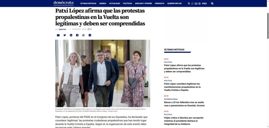 No me han secuestrado, no estoy mandando un mensaje en clave, pero, sí, estoy de acuerdo con Patxi López cuando “afirma que las protestas propalestinas en La Vuelta son legítimas y deben ser comprendidas” (Demócrata). ¡Por supuesto! Nadie puede discutir eso. Lo que tenemos que discutir es que se utilice la violencia (y mover vallas cuando pasan ciclistas profesionales a toda velocidad es violencia) y, sobre todo, que algunos interesados (iba a escribir “desalmados”) utilicen el sufrimiento en Gaza para hacerse un blanqueamiento. Ver a Javier Guillén sufrir para justificar la presencia del Israel Premier Tech es una victoria.