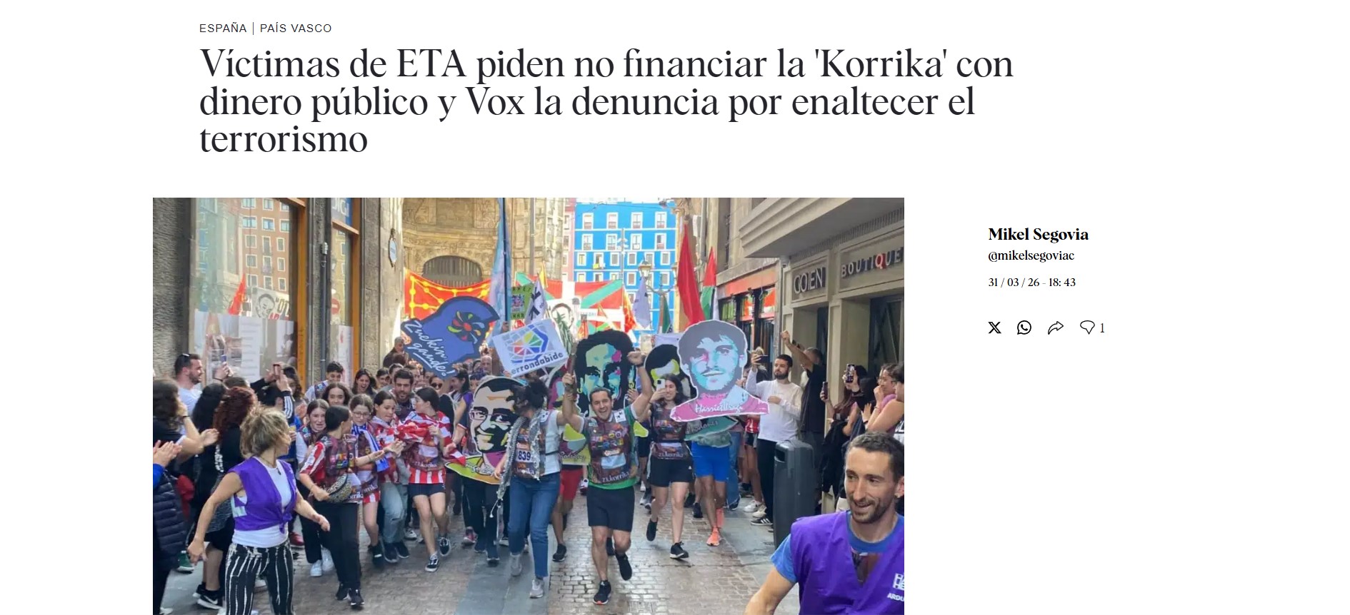 En Euskadi hemos normalizado lo que no es normal, como que en una carrera de apoyo al euskera se legitime el terrorismo de ETA. Visto con un poco de distancia, es una atrocidad como un país de grande, pero estamos demasiado dentro o, mejor dicho, los que tienen que blanquear su pasado están demasiado dentro de algunas empresas (privadas y públicas) y no nos dejan coger un poco de perspectiva. COVITE y la Fundación Fernando Buesa “piden no financiar la Korrika con dinero público”. Y lo que es peor, los ultras ya tienen su excusa: “Vox la denuncia por enaltecer el terrorismo” (El Independiente).