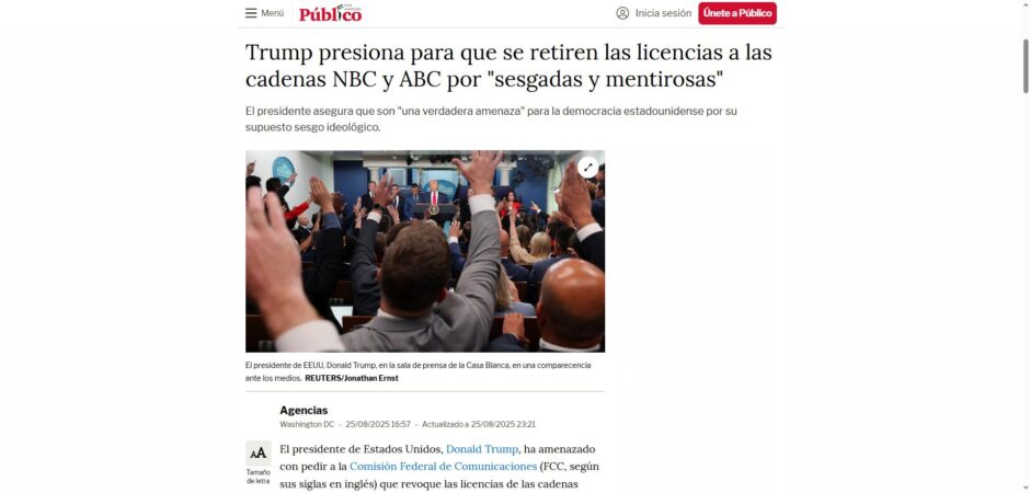 Lo que molesta a Donald Trump beneficia al resto de la humanidad. Le molestan la universidad y los museos, que ha atacado. Le molesta la sostenibilidad del planeta, que le impide hacer los negocios que quiere hacer. Y le molestan las televisiones que no le aplauden acríticamente como NBC y ABC, a las que “presiona para que se retiren las licencias” por “sesgadas y mentirosas” (Público). No le resultan ni sesgados ni mentirosos los comunicadores de extrema derecha que montan plataformas (muy rentables económicamente, por cierto) para difundir sus mierdas fascistas, esas en las que se muestra tan cómodo Trump.