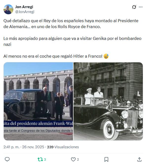 Esto que Jon Arregi cuenta en X es la mejor muestra de lo que es la España institucional hoy: “Qué detallazo que el Rey de los españoles haya montado al Presidente de Alemania… en uno de los Rolls Royce de Franco. Lo más apropiado para alguien que va a visitar Gernika por el bombardeo nazi. ¡Al menos no era el coche que regaló Hitler a Franco!”. Una España institucional en la que, por la foto, parece que nadie ha caído en la cuenta de que el descendiente del impuesto por Franco como su sucesor viene a Gernika a hacer de anfitrión, como si la Legión Cóndor no hubiese lanzado las bombas a favor del franquismo.