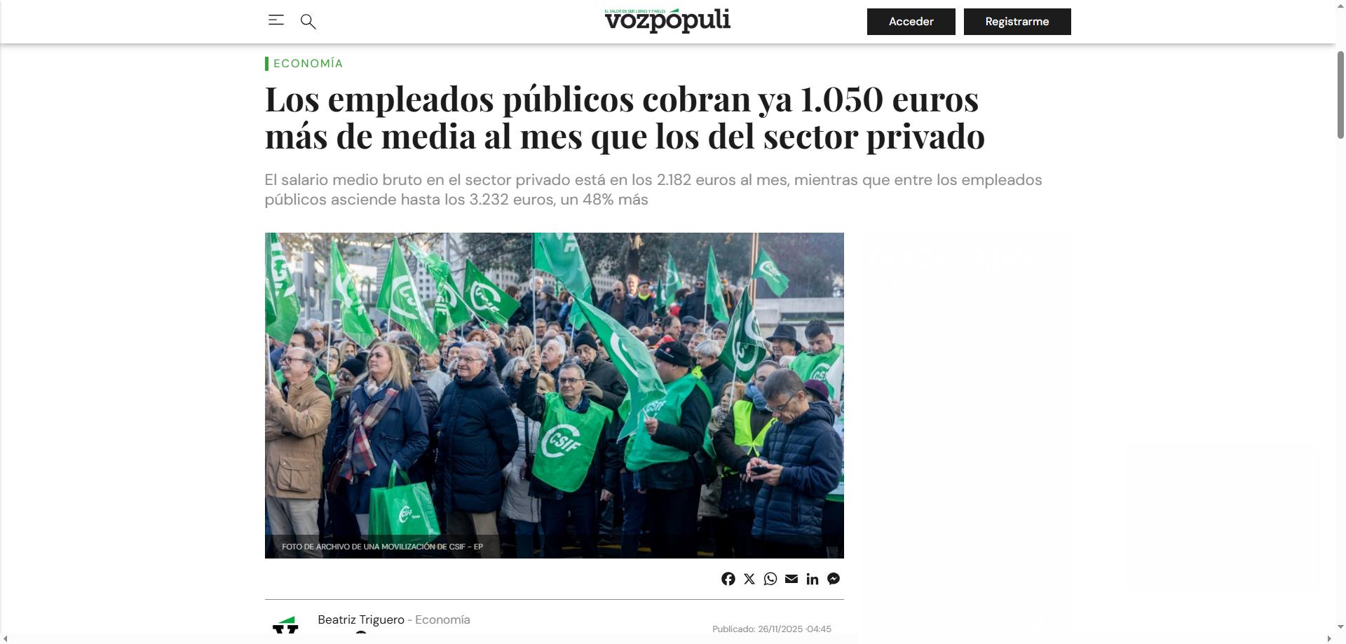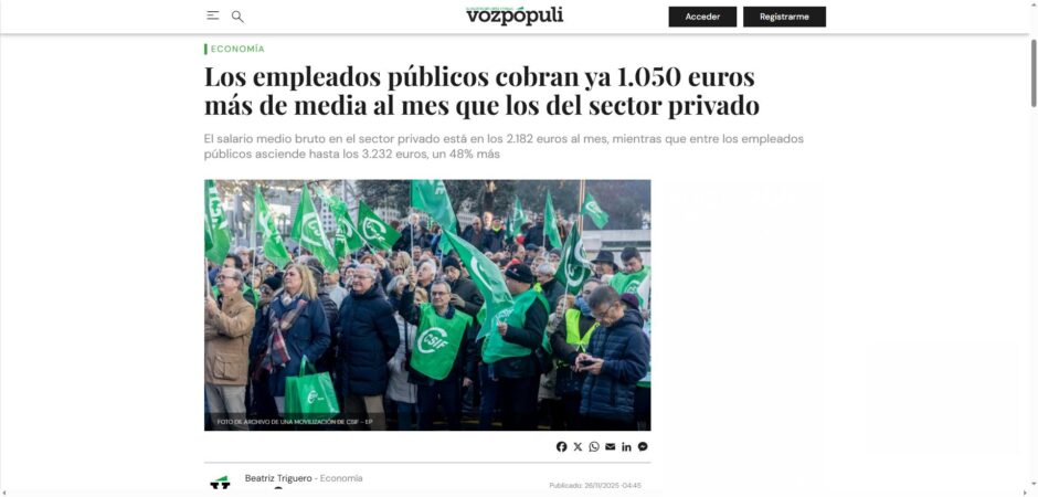 Estoy absolutamente a favor de la mejora de las condiciones laborales de todas las personas, aunque confieso que la primera vez que vi una nómina de diciembre, con su paga extra, pregunté en voz alta: “¿Y esto es así para todo el mundo?”. La inocencia de los autónomos, ya se sabe. Pero oigo la noticia de la subida de sueldo del funcionariado (que me parece bien, por supuesto) y leo esto en Vozpópuli: “Los empleados públicos cobran ya 1.050 euros más de media al mes que los del sector privado”, y me hago alguna pregunta, claro. ¿Quién va a pagar la fiesta? ¿No habría que mejorar también la vida de quien genera la riqueza?