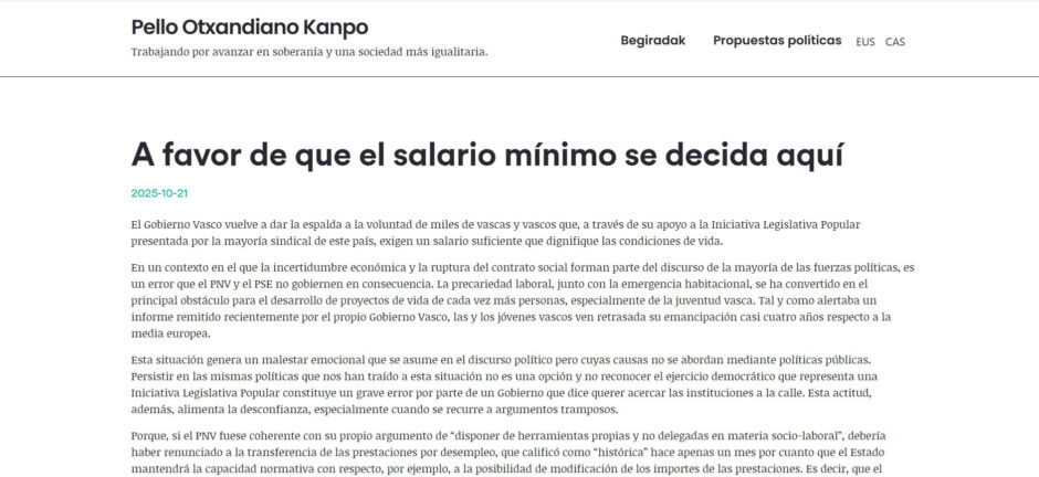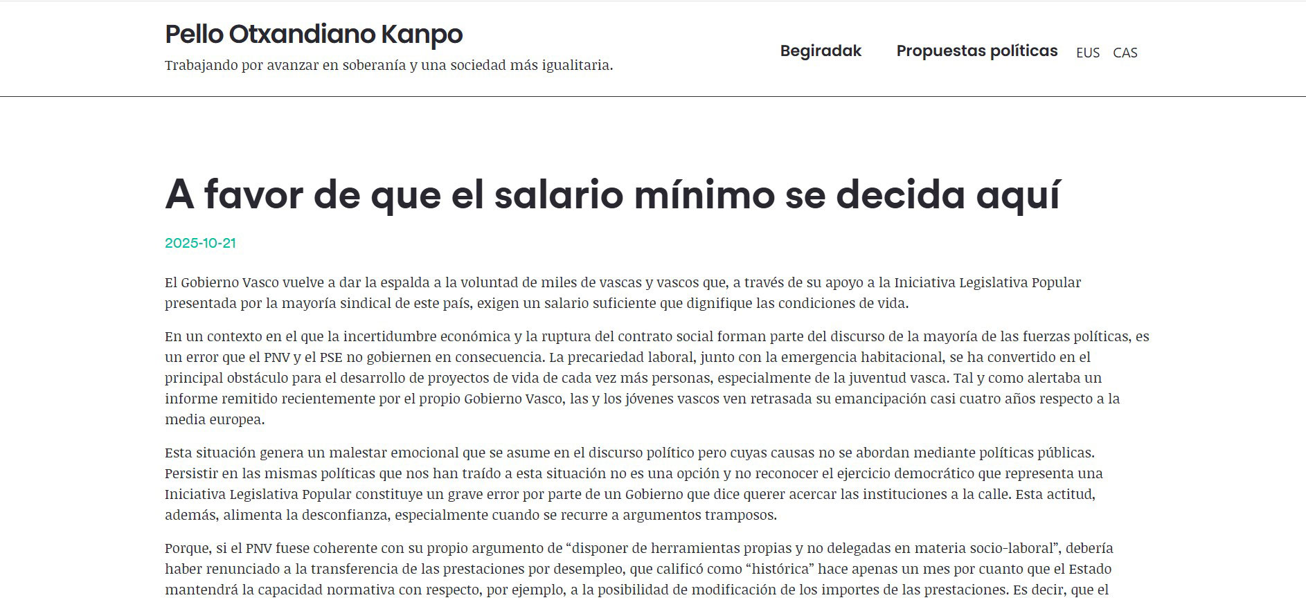 Escribe Pello Otxandiano en su blog que él está “a favor de que el salario mínimo se decida aquí”. ¿Quién no va a estarlo cuando ese “aquí” significa un país mucho más próspero y sostenible que los de su entorno, al sur y también al norte? Pero la clave, como en todo, es precisamente el cómo, el modelo, las piezas que tenemos que poner una delante de otra para lograrlo. Y la iniciativa popular en el Parlamento (de Gasteiz, no de Iruñea), esa que avalan Otxandiano y ELA, no es el camino reglamentario. Lo saben (y si no lo saben, que se aparten, pero lo saben), como saben que el populismo y la política no son lo mismo.