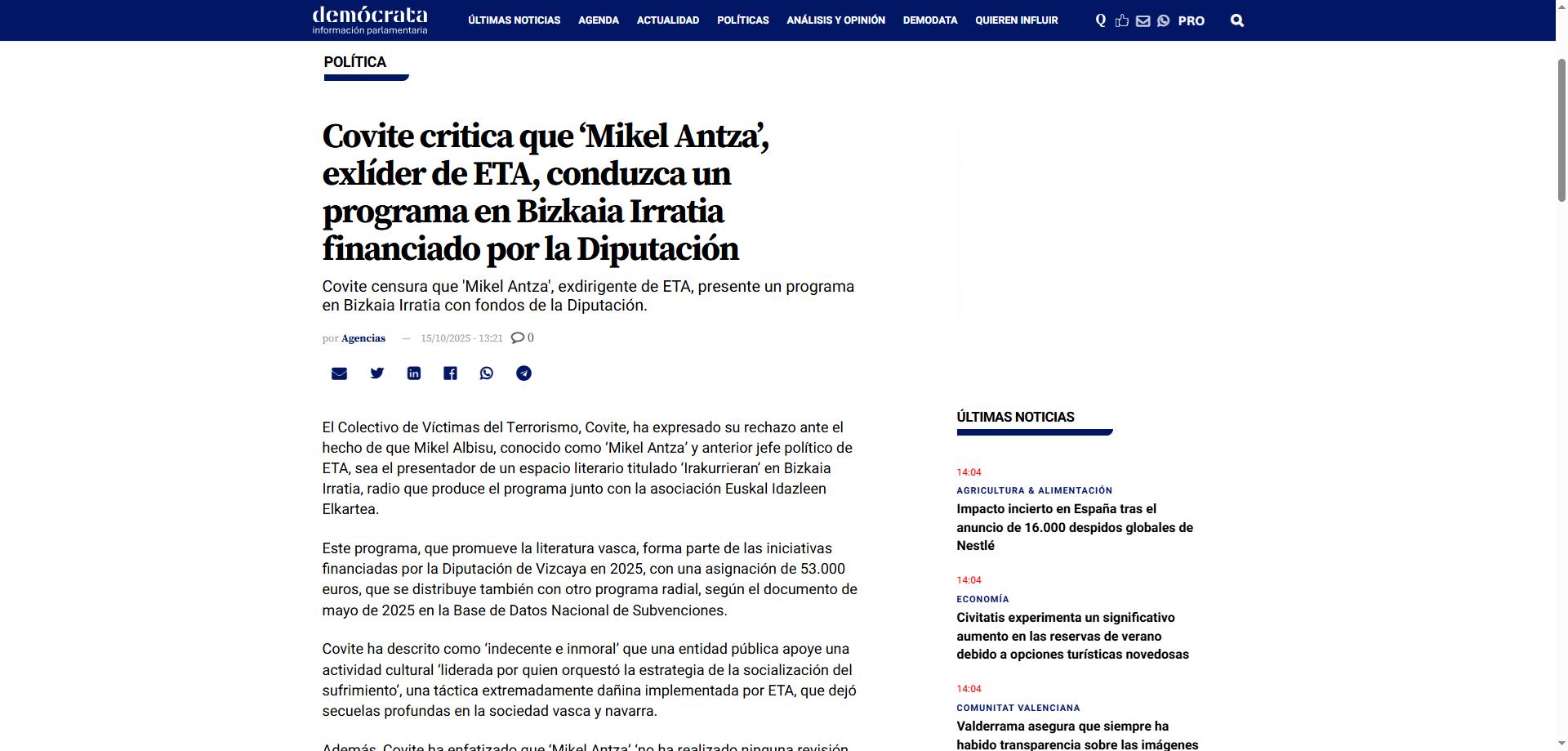 En Demócrata he encontrado el titular más amable sobre el tema: “Covite critica que ‘Mikel Antza’, exlíder de ETA, conduzca un programa en Bizkaia Irratia financiado por la Diputación”. ¿A quién le pareció buena idea poner a uno de los jefes de ETA al frente de un espacio cultural, arriesgando la reputación de la emisora y, de paso, señalando a quien facilita su subsistencia? Ya conozco el tecnicismo: ¿tienen sus derechos recuperados los expresos? Por supuesto, pero la vergüenza no debería ser restituida con la misma facilidad. De hecho, quien no mostró ni muestra la sensibilidad más básica carece de sensibilidad creativa, por mucho que la fuerce.