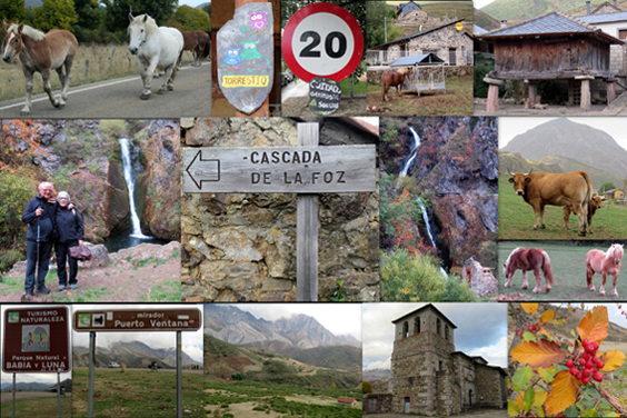 Tras comer e instalarnos en el hotel, a media tarde nos desplazamos tan solo 12 km a Torrestío, pequeño núcleo rural de unos 48 habitantes perteneciente al concejo de San Emiliano, donde tratan de limitar la velocidad de los coches para proteger a las gallinas que campan a sus anchas. De camino vimos por la carretera a un buen grupo de caballos que se dirigían a San Emiliano. Una vez en Torrestío, contemplamos un par de hórreos y caminamos bajo la lluvia un par de kilómetros hasta la preciosa cascada de La Foz. De vuelta en el coche continuamos hasta el Mirador Puerto Ventana y, de regreso al hotel, nos detuvimos junto a la iglesia de Candeluela, uno de los mejores ejemplos del barroco rural en la montaña leonesa, que fue construida en 1725. Como sucedió después en otros pueblos, estaba cerrada.